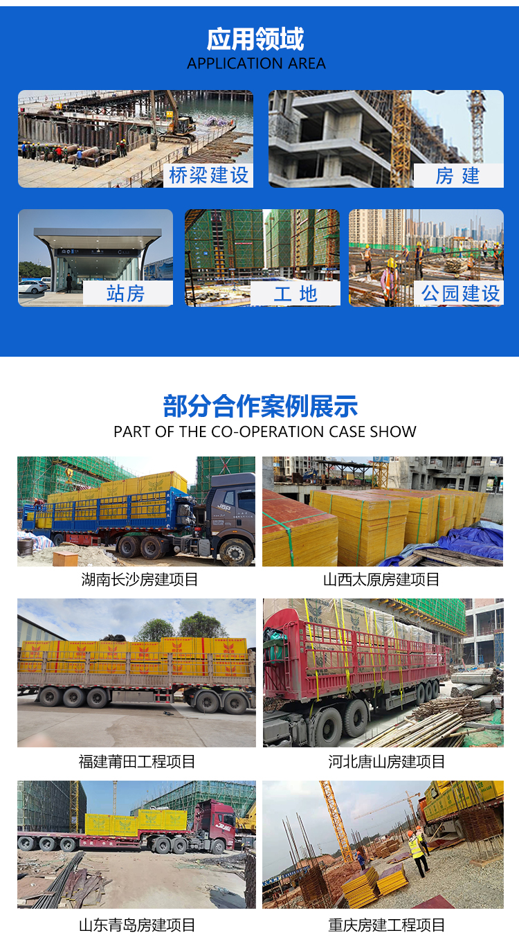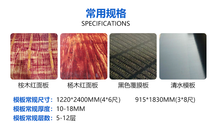 2、建筑模板表面涂層為防水性能強的酚醛樹脂膠,芯板采用三氨膠(單層過膠達(dá)0.45KG),采用層層過膠;